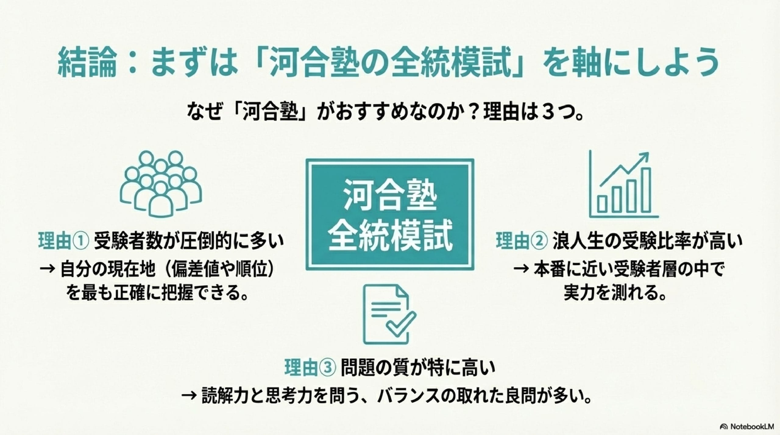 結論として、浪人生・宅浪生には「河合塾の全統模試」をおすすめします。