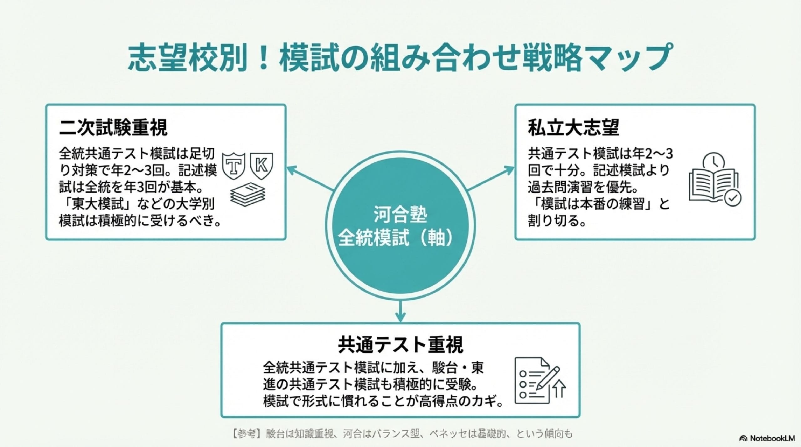 もちろん「駿台模試」や「東進模試」も問題品質が高いので「河合塾の全統模試を軸に、他の模試を足していく」というのが良いと思います。