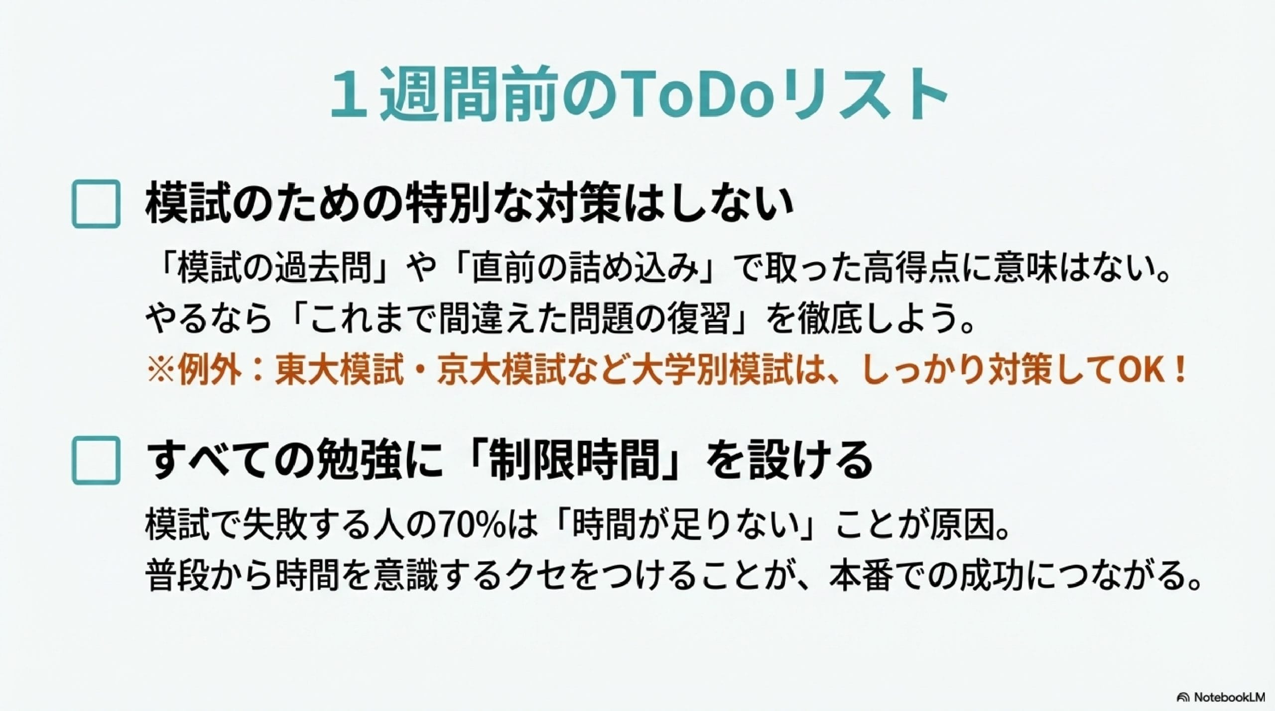 模試や本番でうまくいかない人の70%は「試験時間が足りなかった」に起因します。