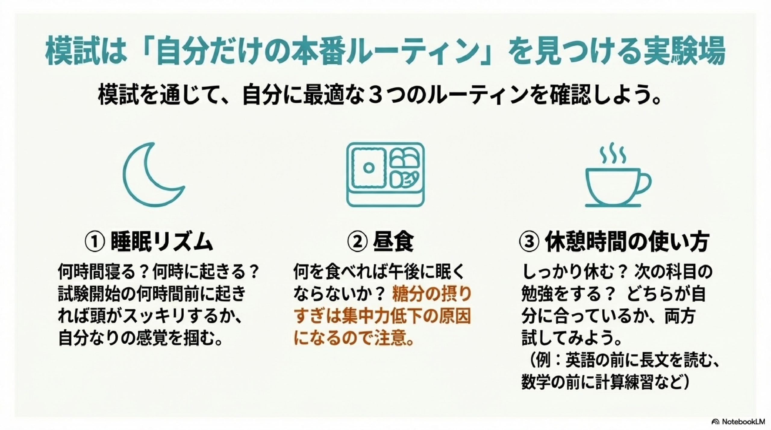 睡眠は試験当日の集中力に大きく影響してくるので、模試を通じて「大体試験開始の〇時間前に起きればいいな」という自分なりの感覚を掴んでおくことが重要です。