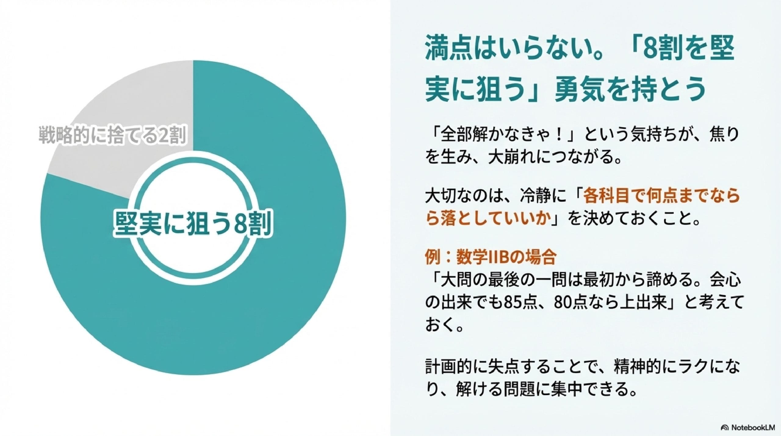 試験本番ではもっと冷静に「8割を堅実に狙う」という心構えが重要です