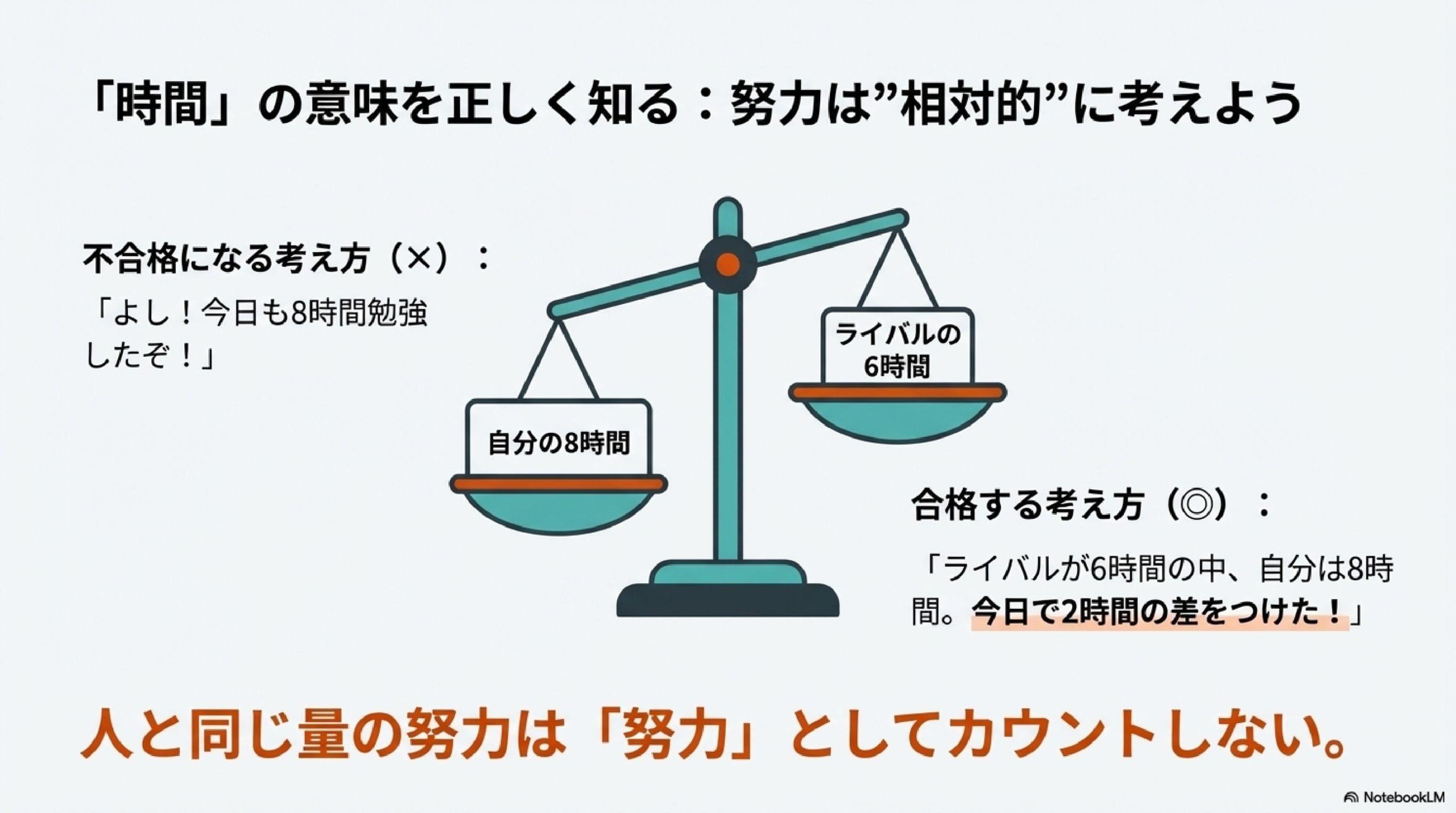 ライバルが6時間勉強している中、俺は8時間だから今日で2時間差をつけた!→◎