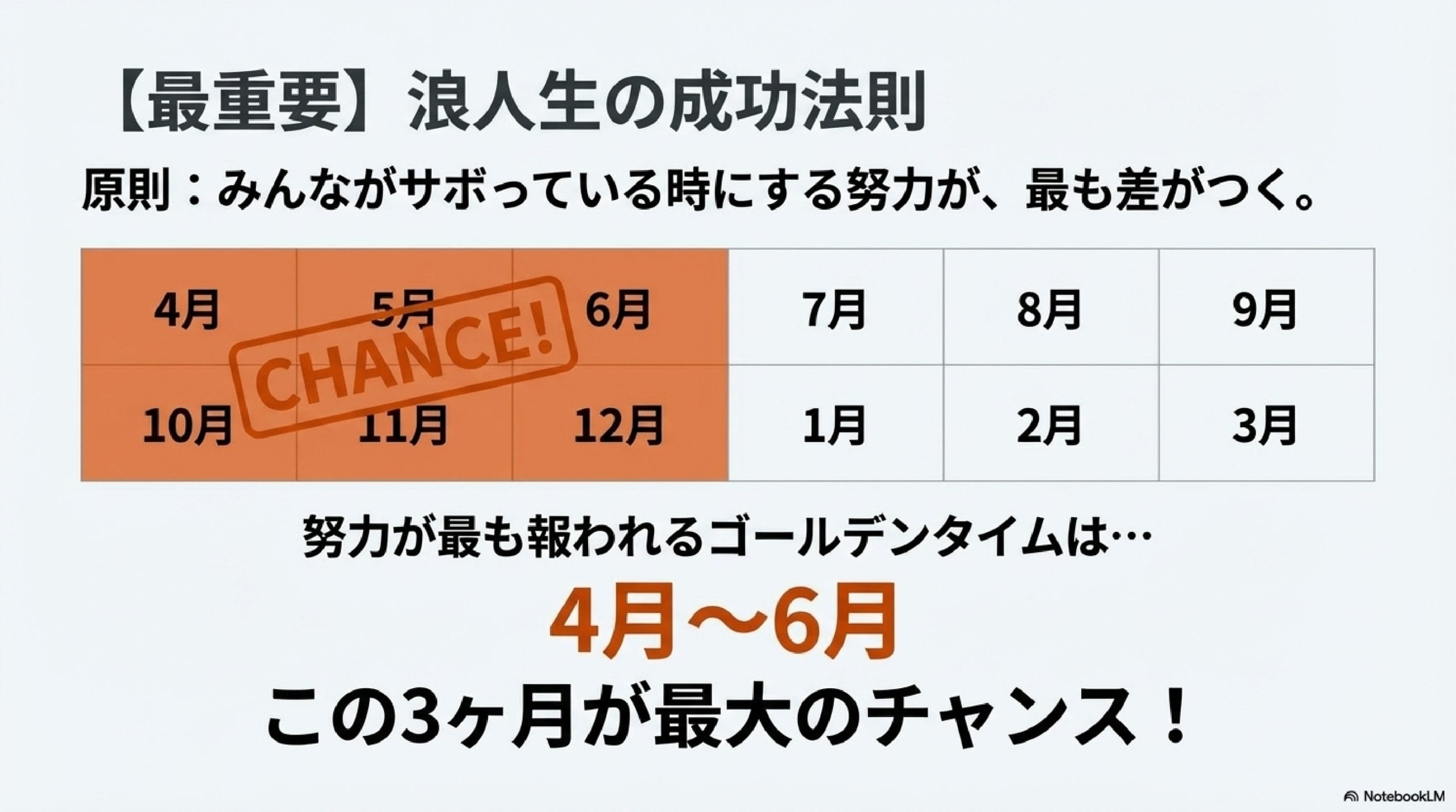 浪人を成功させたいのなら、6月までに死ぬ気で努力しましょう。4月から6月までの3ヶ月間が最も努力が報われやすいです。