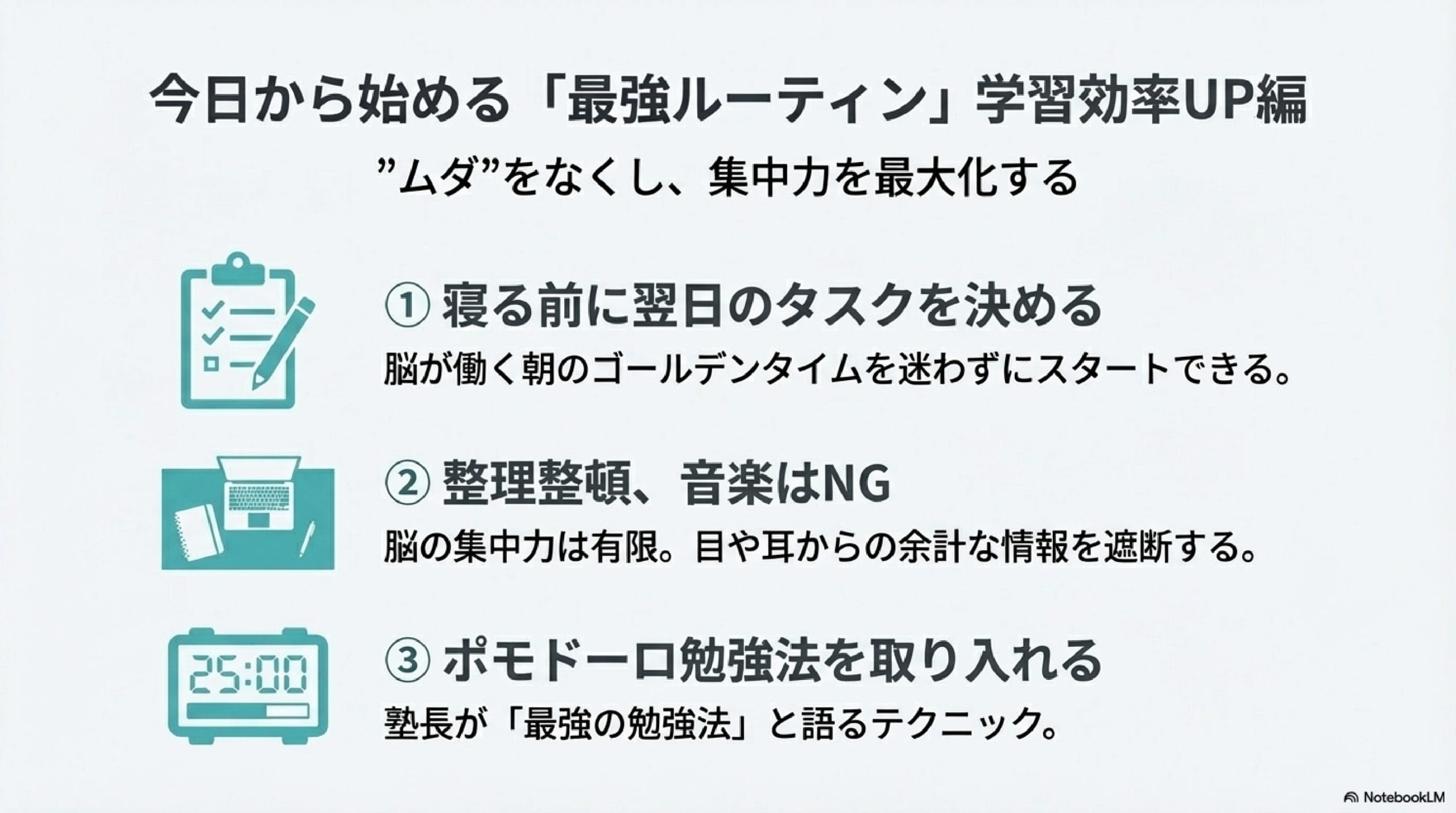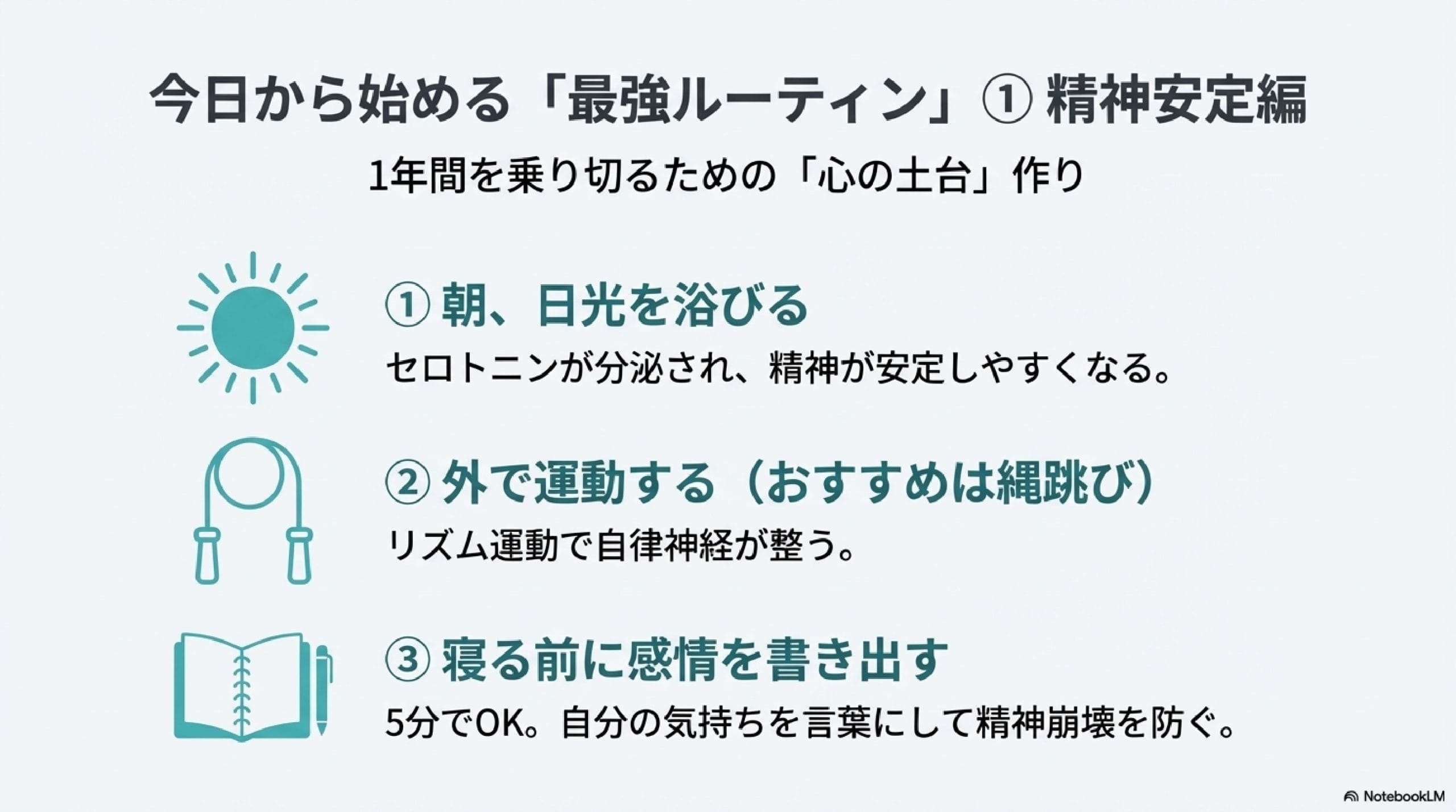 具体的には「精神を安定させるためのルーティン」と「学習効率を高めるためのルーティン」です