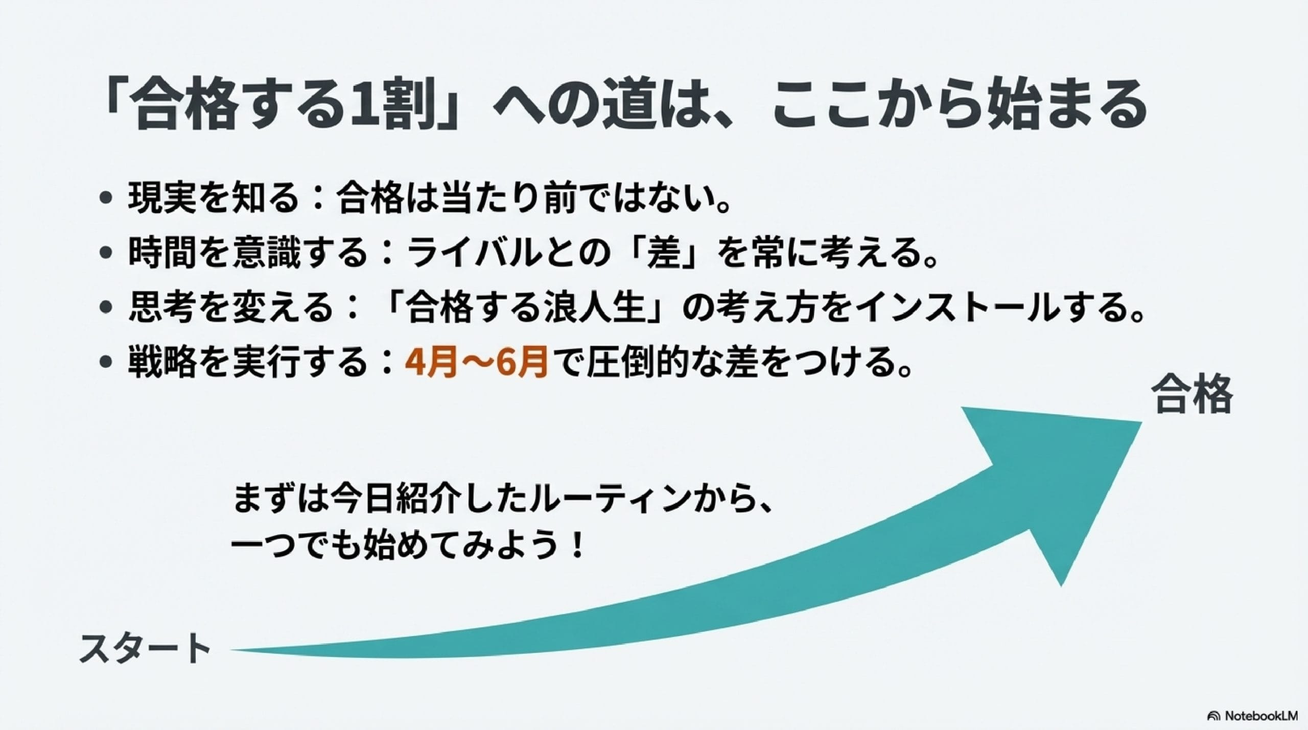 繰り返しですが、浪人生の成功法則は「4月~6月までの3ヶ月間で圧倒的な差をつけること」です。ここを意識しておけば、きっといい結果を残すことができます。