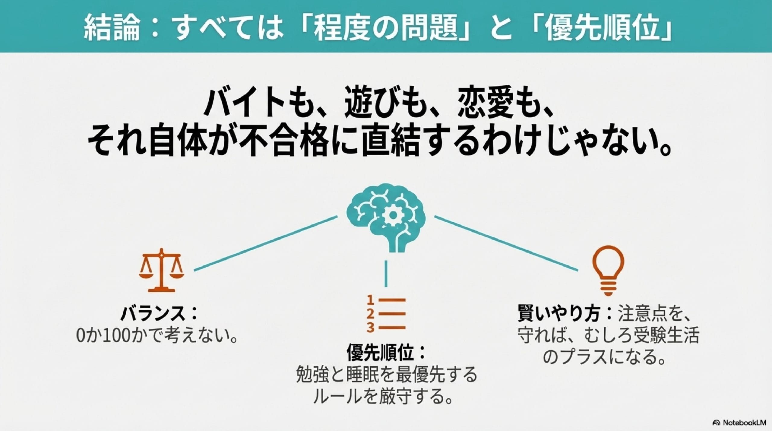 結局のところ、バイトも遊びも恋愛も程度の問題であり、優先順位を厳守すれば不合格に直結するわけではありません。