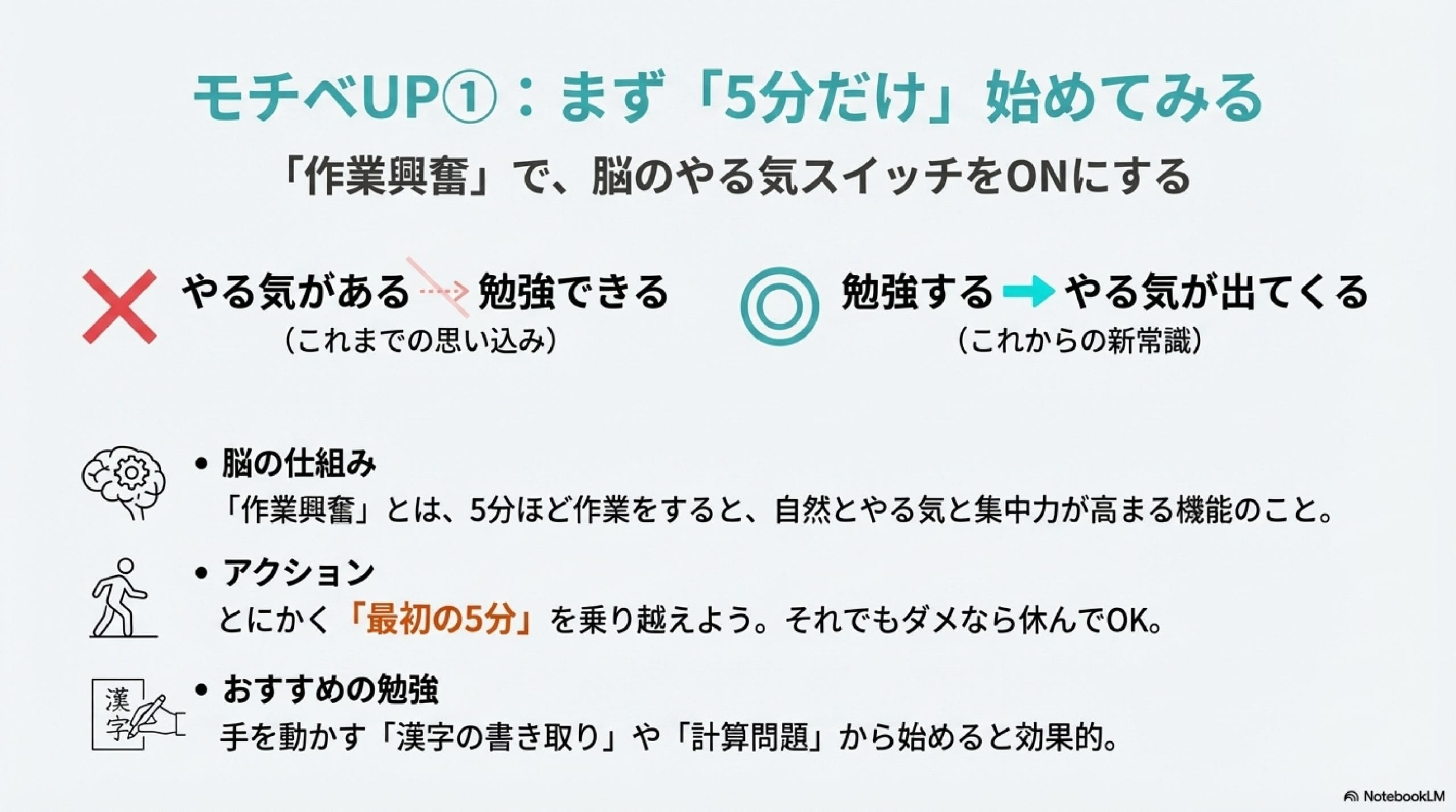 作業興奮の発動条件は「5分勉強する」だけです。