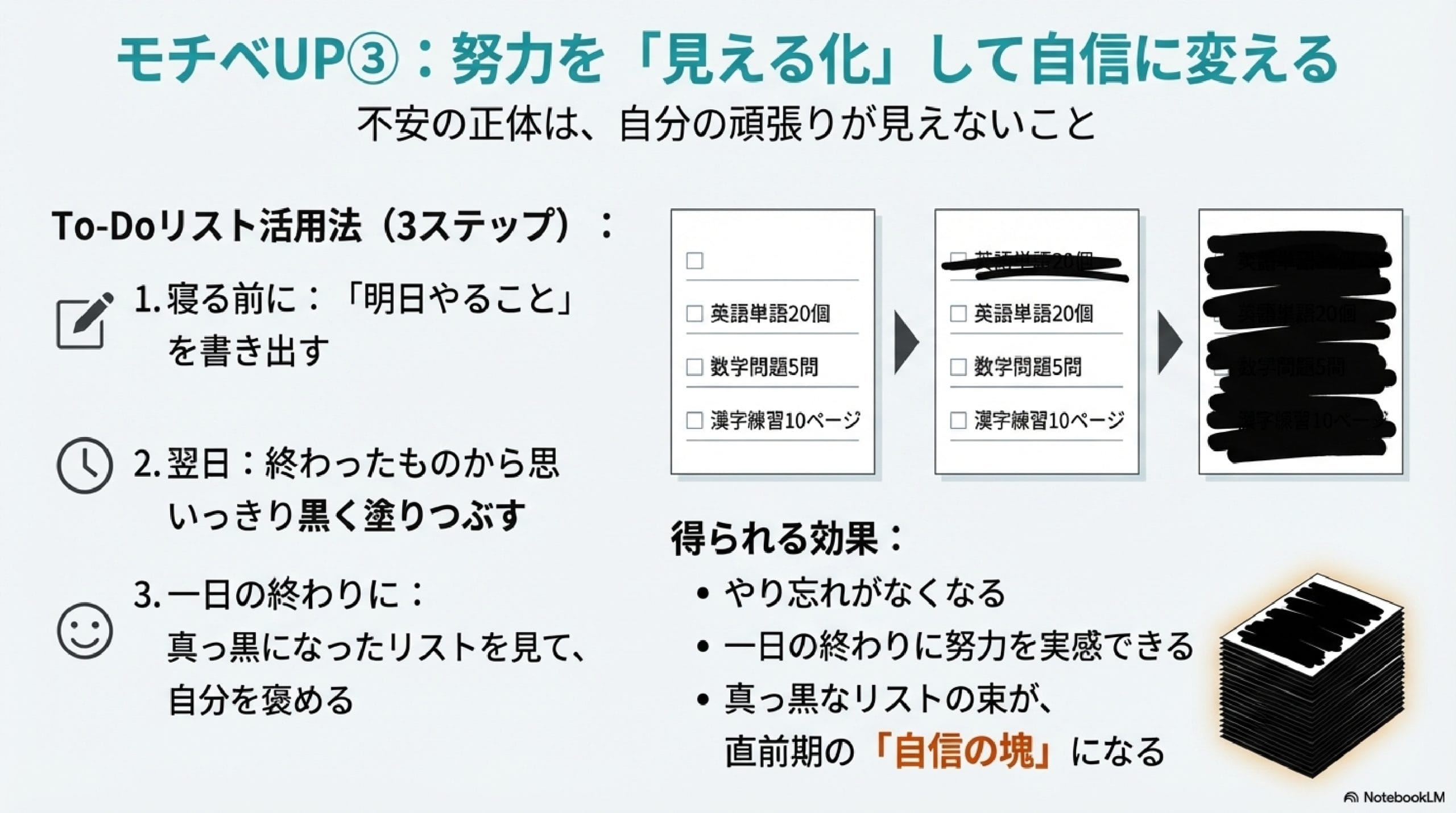 さらに直前期に「真っ黒のTo-Doリストの束を見る」と自信が湧いてきます。