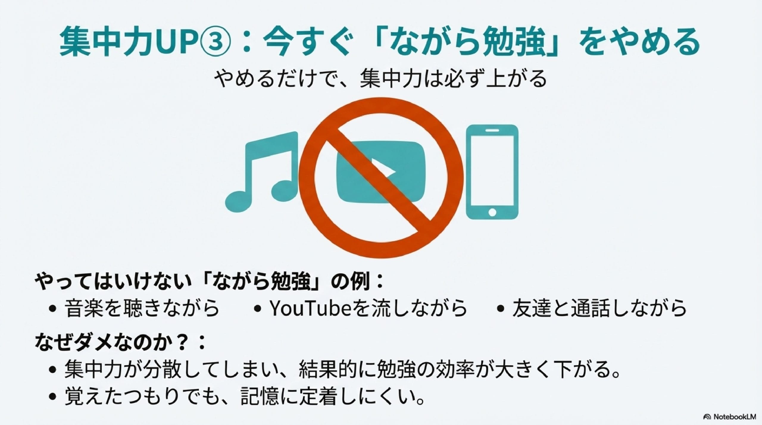 ながら勉強をすることで集中力が分散してしまい、結果的に覚えが悪くなります。