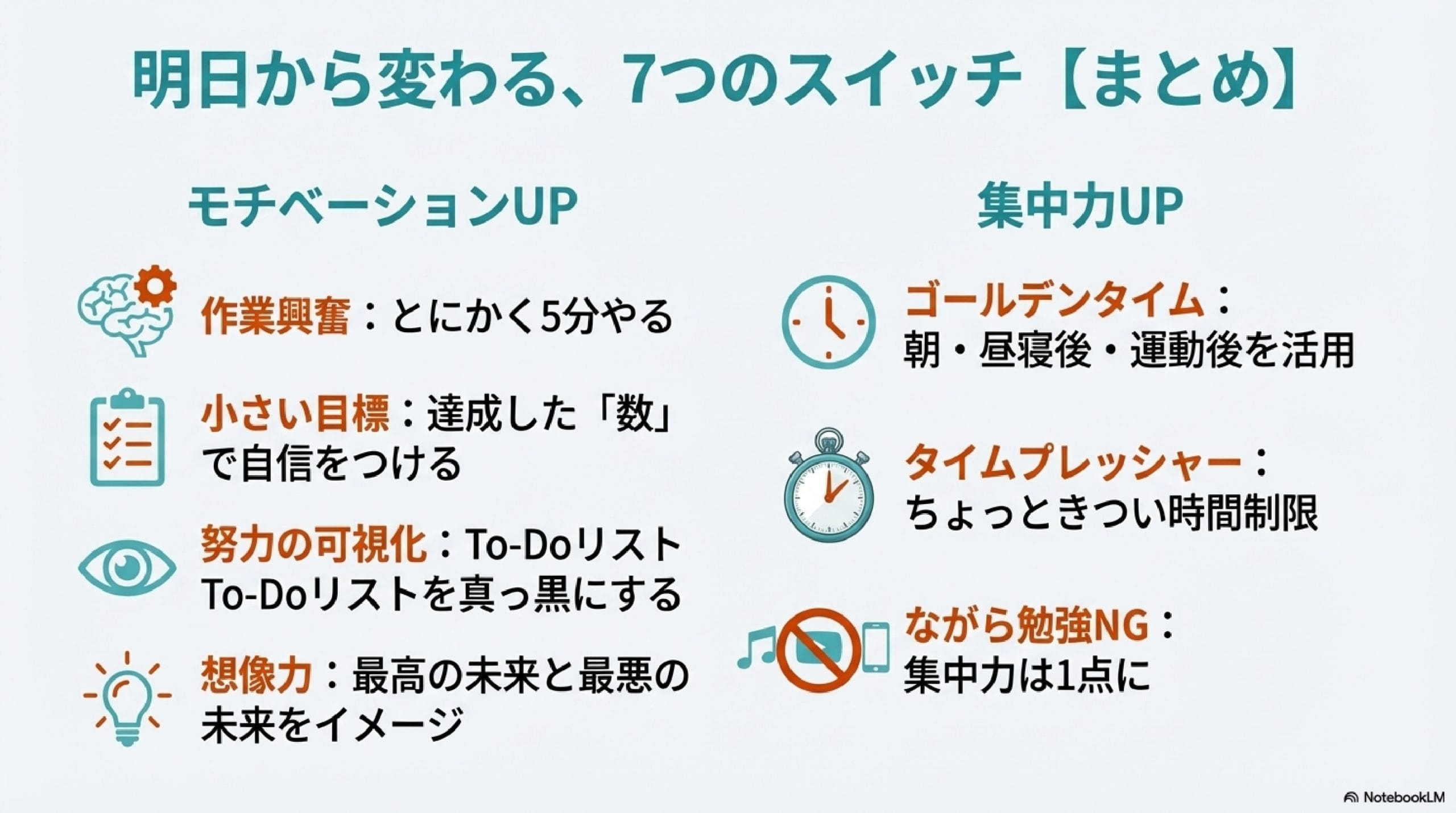 今回はモチベーションと集中力を高める方法を解説しました。