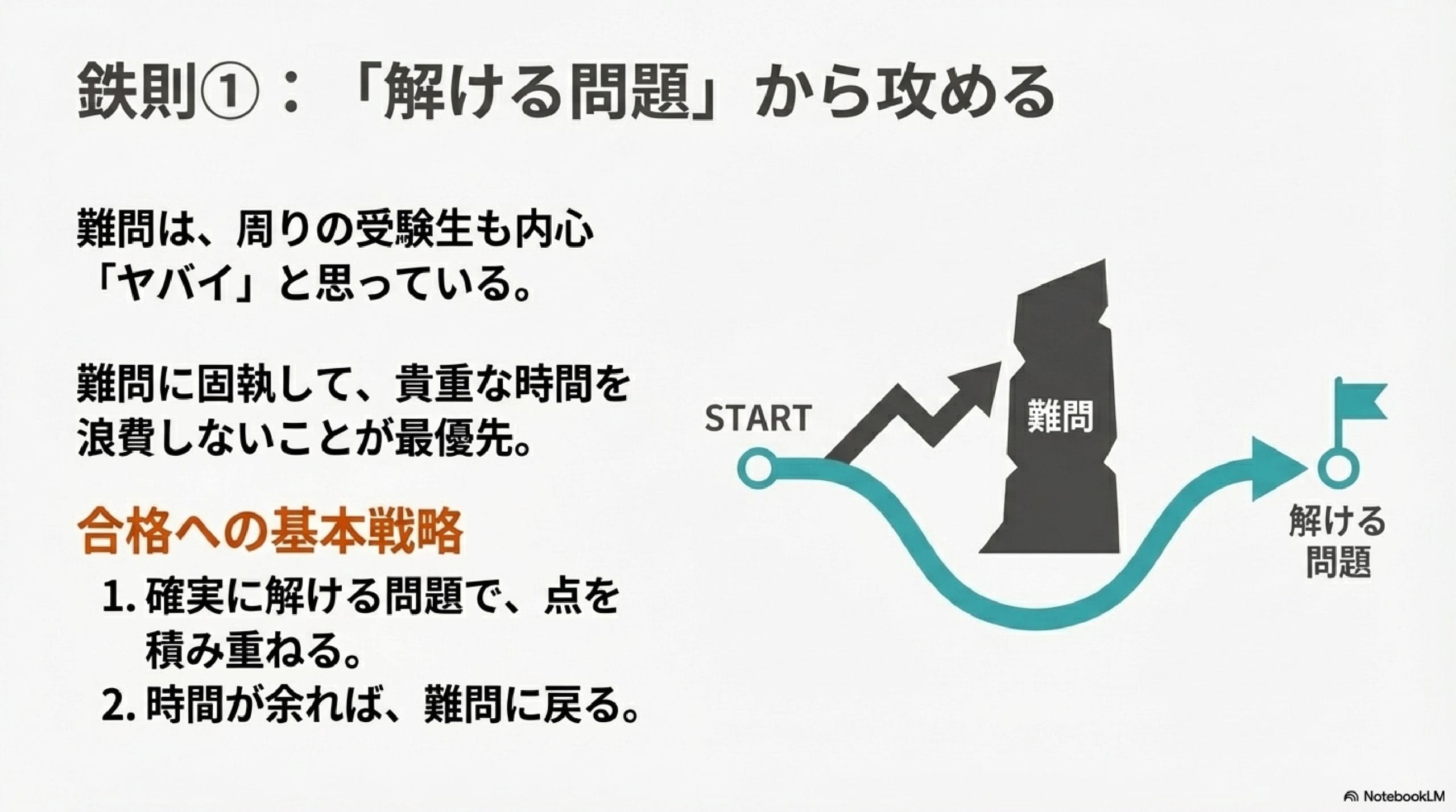 具体的には「難問に固執して貴重な時間を浪費しないこと」であり、まずは「確実に解ける問題」を見つけ、点を積み重ねるのが合格への基本戦略です。解ける問題で確実に得点を積み上げ、時間が余れば難問に戻ればよいです。