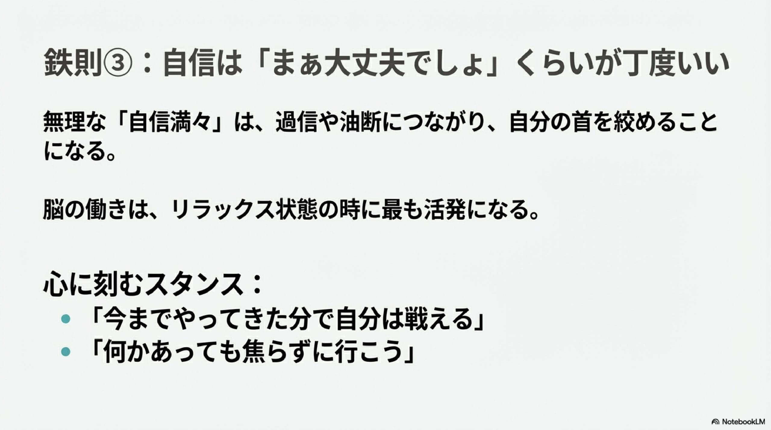 しかし、無理に「自信満々」を演じる必要はないですし、無理に自信を持つことは過信や油断に繋がるので全くお勧めしません。自分で自分の首を絞めることになります