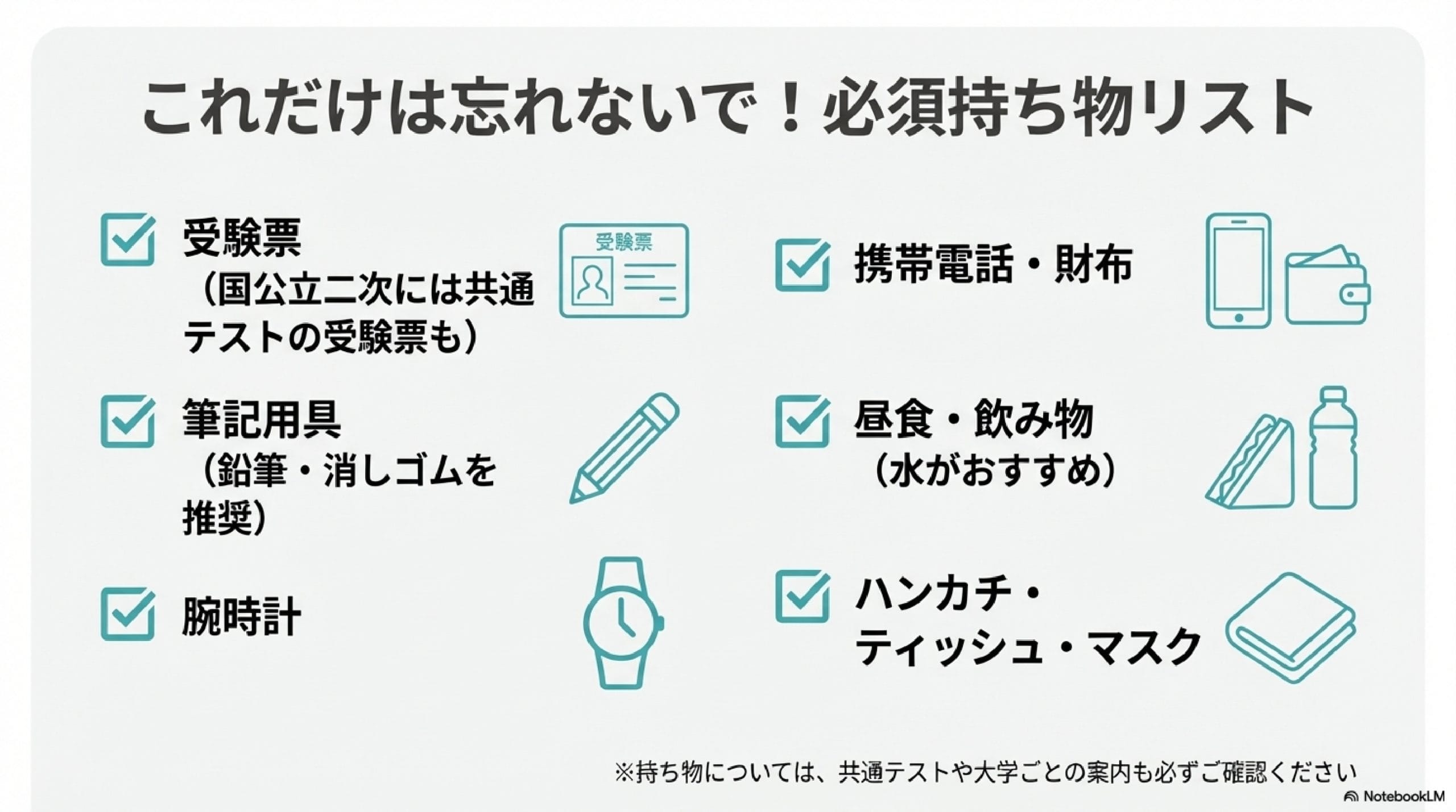 ※持ち物については、共通テストや大学ごとの案内も必ずご確認ください