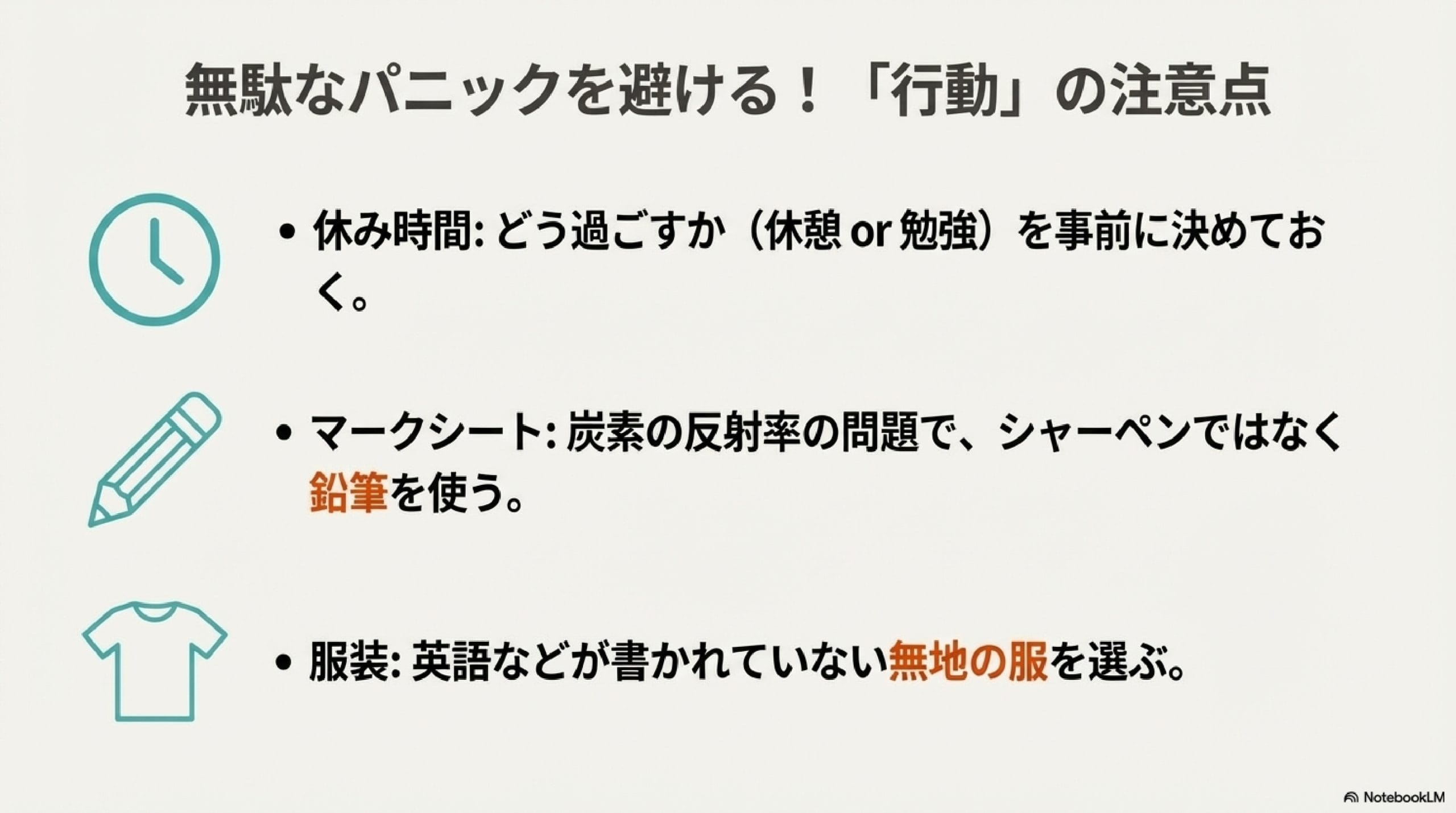 試験当日の注意点一覧