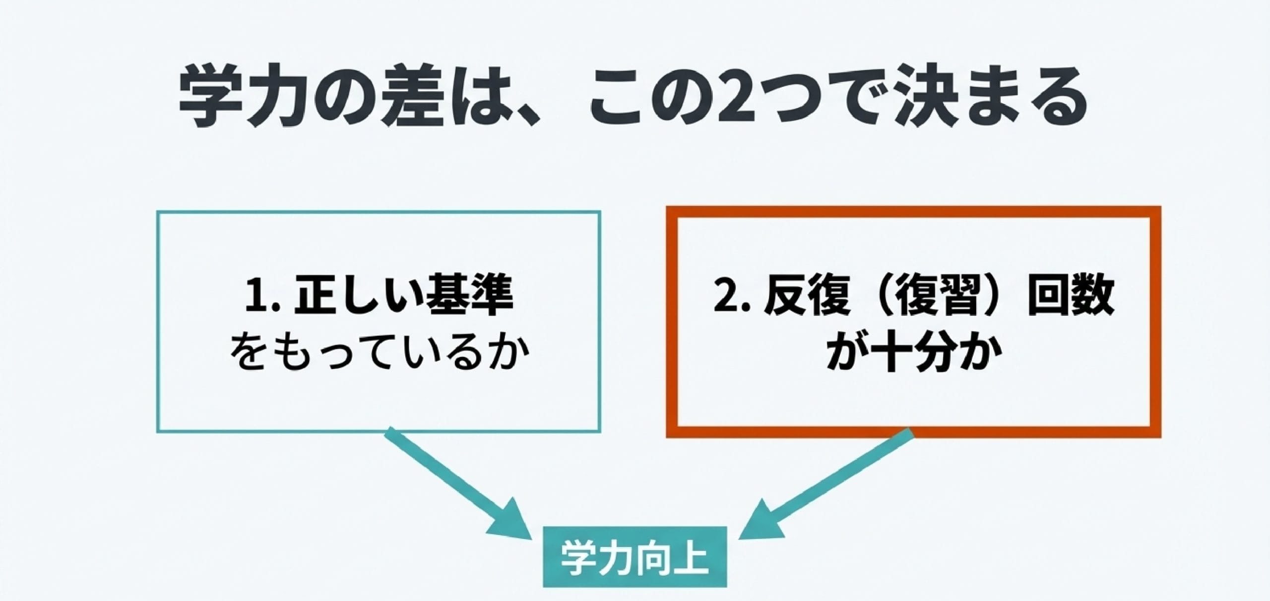 そして、②の「反復(復習)回数が十分か」に関しては文字通りそのままで、「勉強する⇒頑張って思い出す」というプロセスを何度繰り返したかが大事になります。
