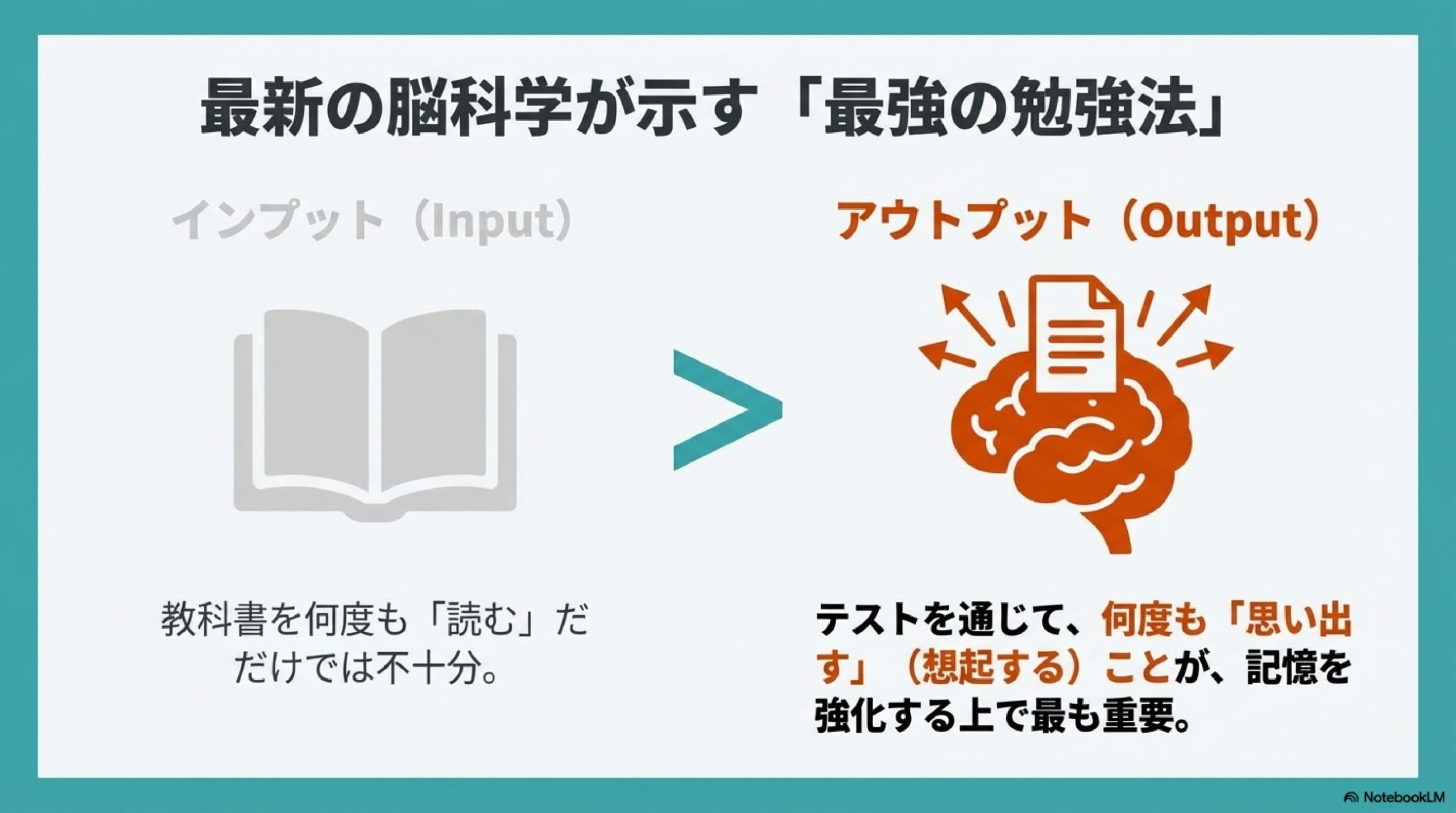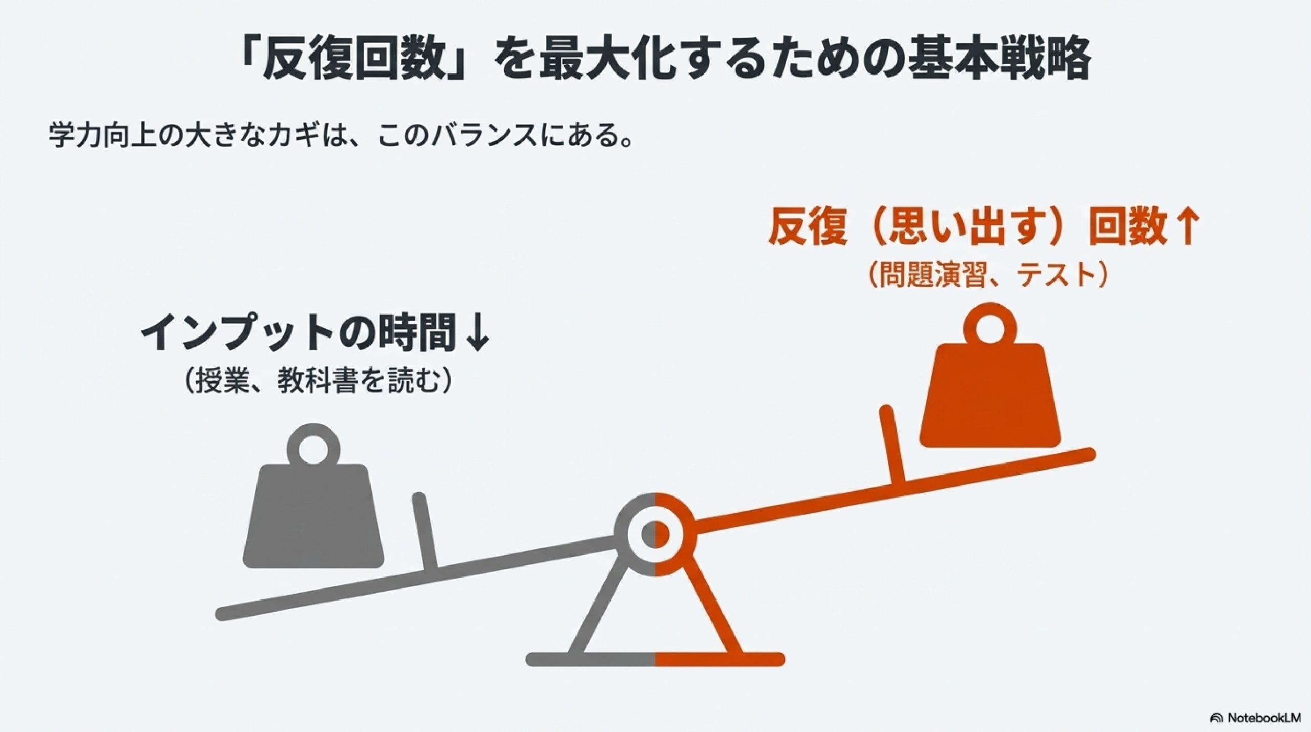 結局のところ、学力を上げる上では後述する「思い出そうとする回数(反復回数)の最大化」が重要でして、わざわざ重要度の低い「インプット」を時間のかかる授業で行う必要がないということでした。