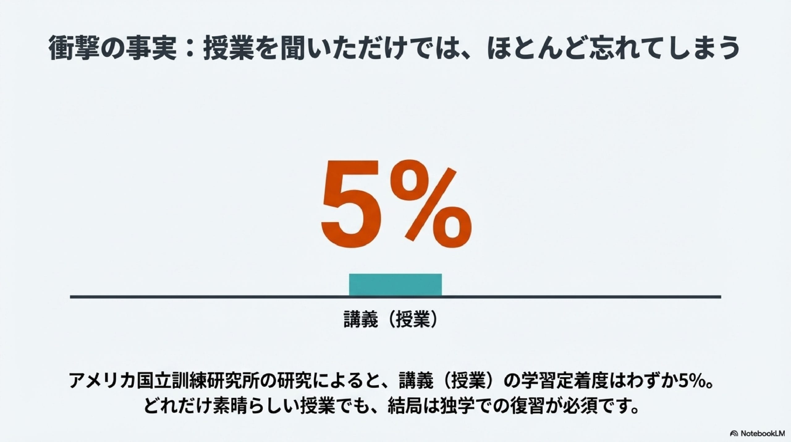 講義や授業の学習定着度は5%しかないことがわかります。統計的に導かれた結論ですので、例えば「質のいい授業ならもっと定着度が高い!」という反論は一般に成立しません。