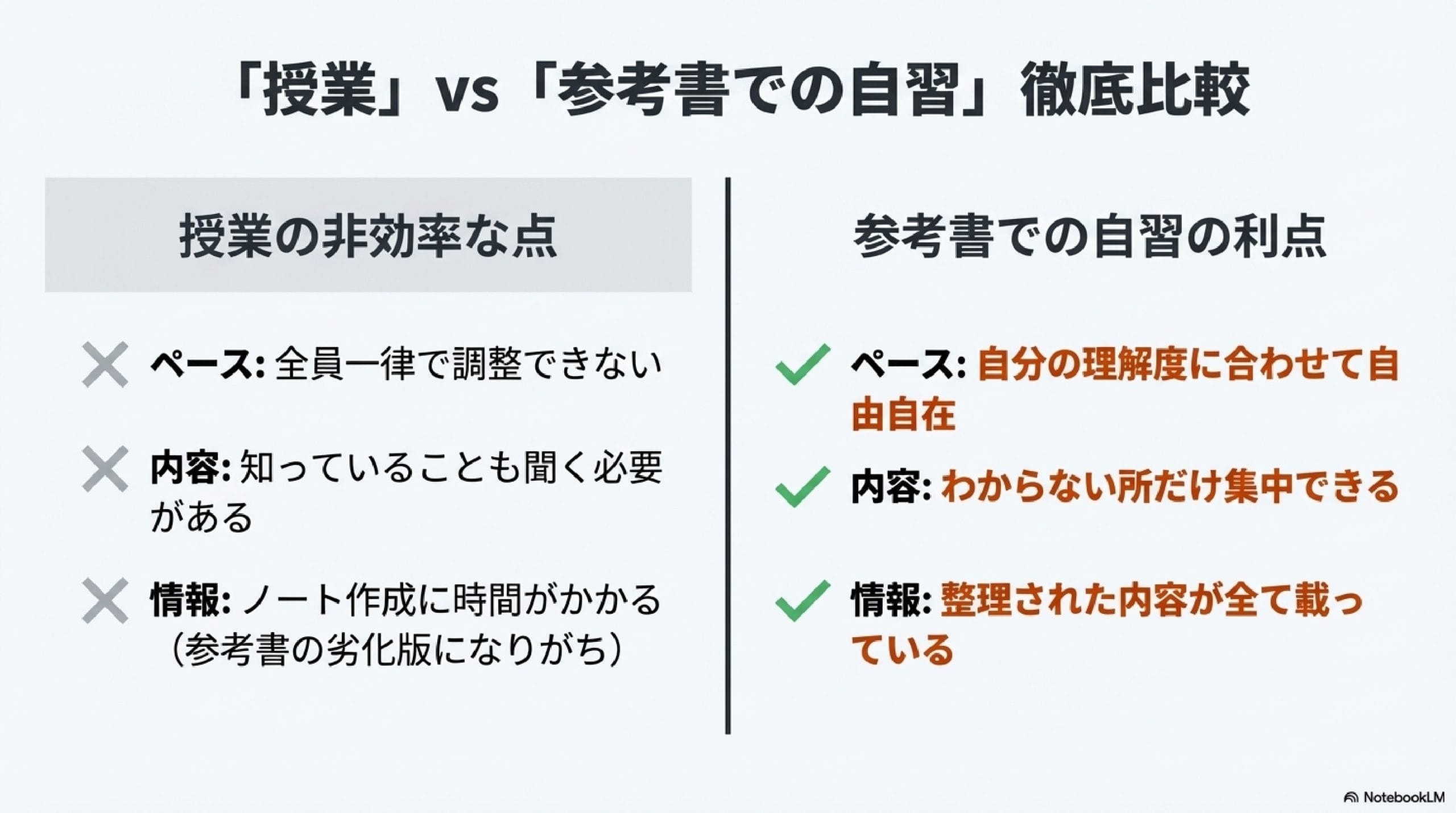 ここでは「授業と自習」を対比しながら、参考書を使った自習スタイルの利点を整理していきます。