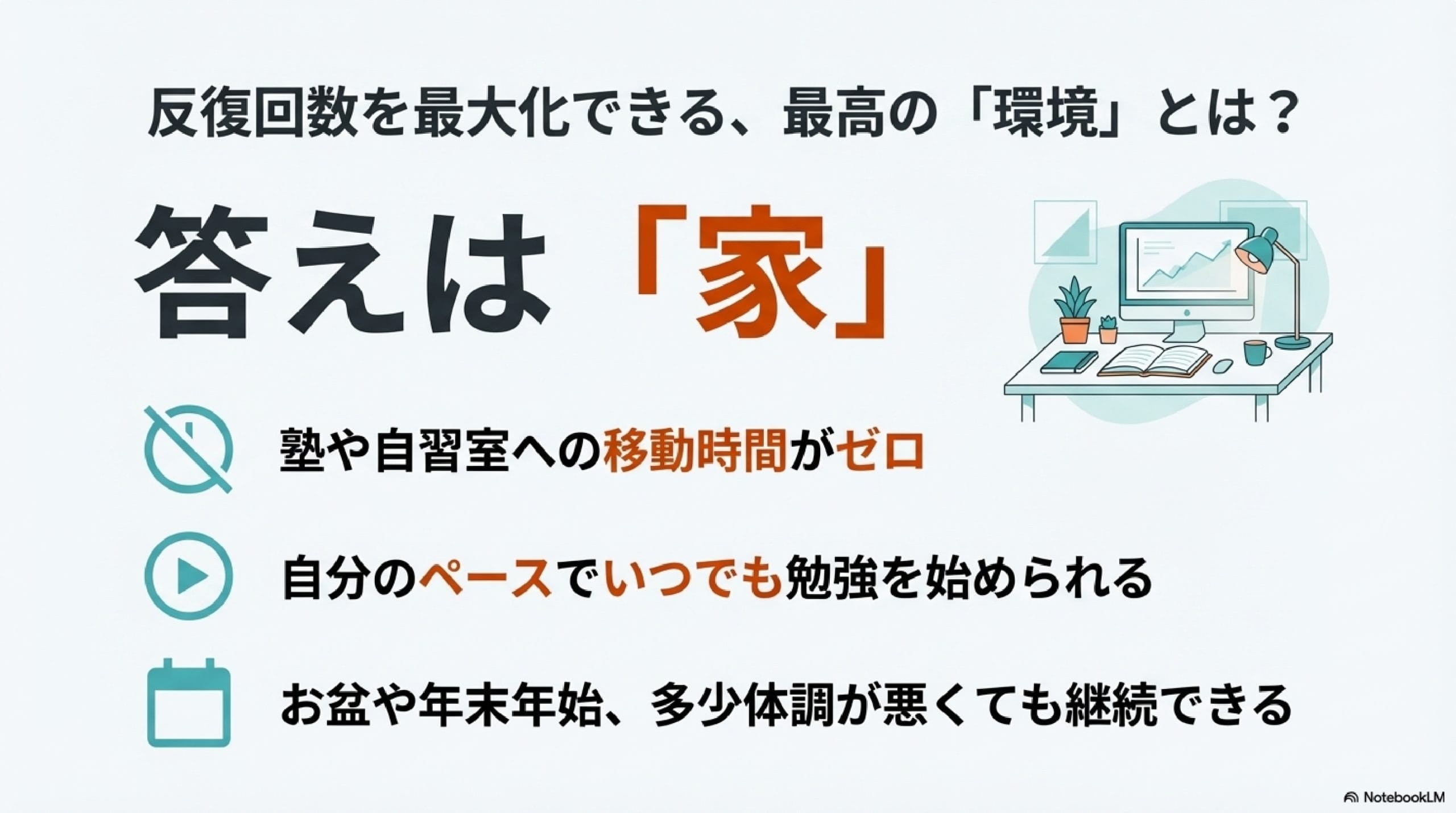 学校や塾の方が集中できるという意見も理解できますが、仮に予備校に通っていても「家でも勉強できること」は合格の必要条件です。多少体調が悪くても家ではできますし、お盆や年末年始も家で勉強する必要があります。