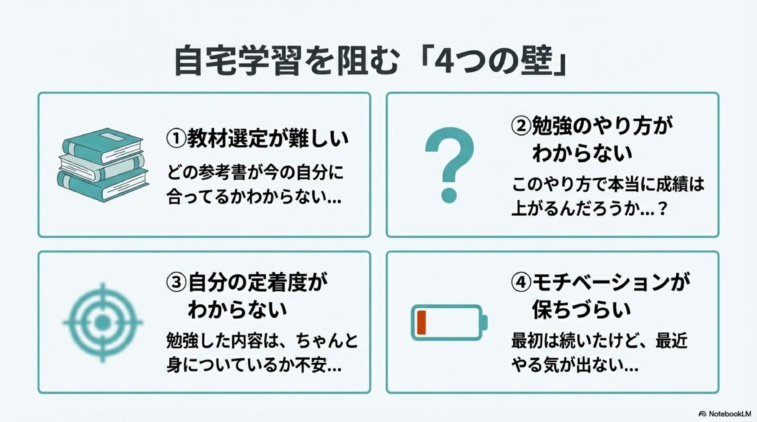 ここまで熱弁してきた「自習スタイル」にも難しさがあります。大きく話しても4つほどあり、この難しさがあるからこそ、私たちの「オンラインサポート」の意義があります。