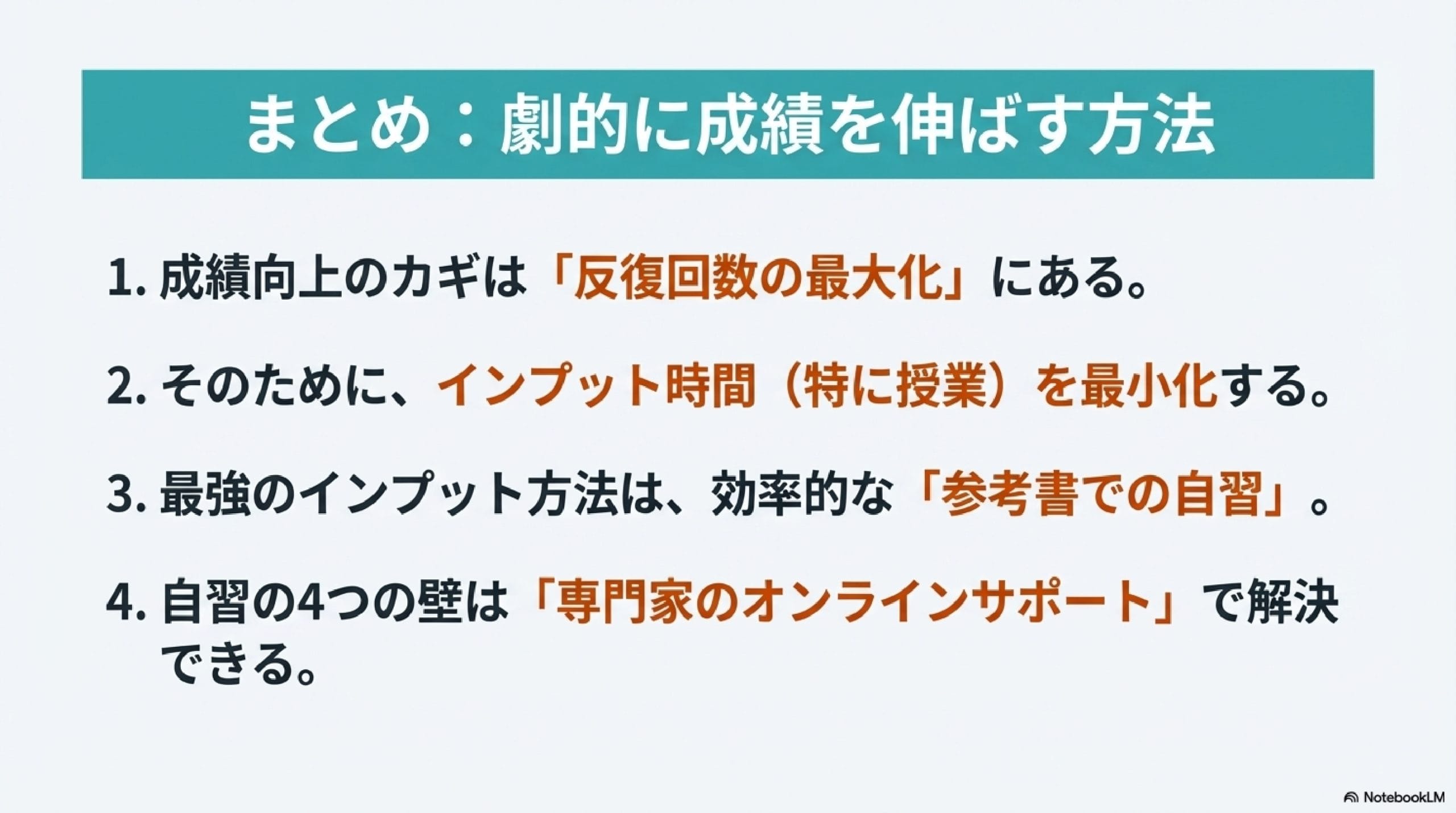 つまり、どれだけ素晴らしい授業を受けたとしても、結局は独学で何度も復習する必要があります。