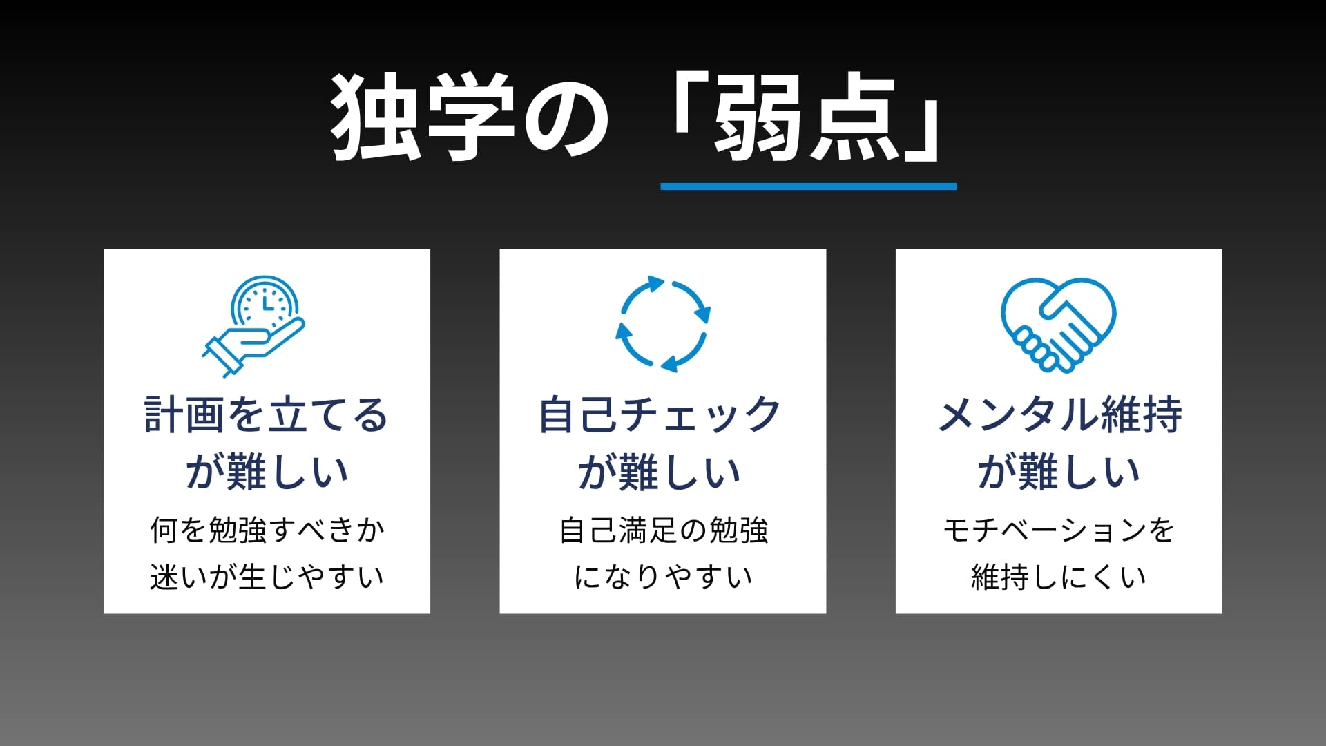 とはいえ、独学にも「弱点」があります。具体的には3つあります。