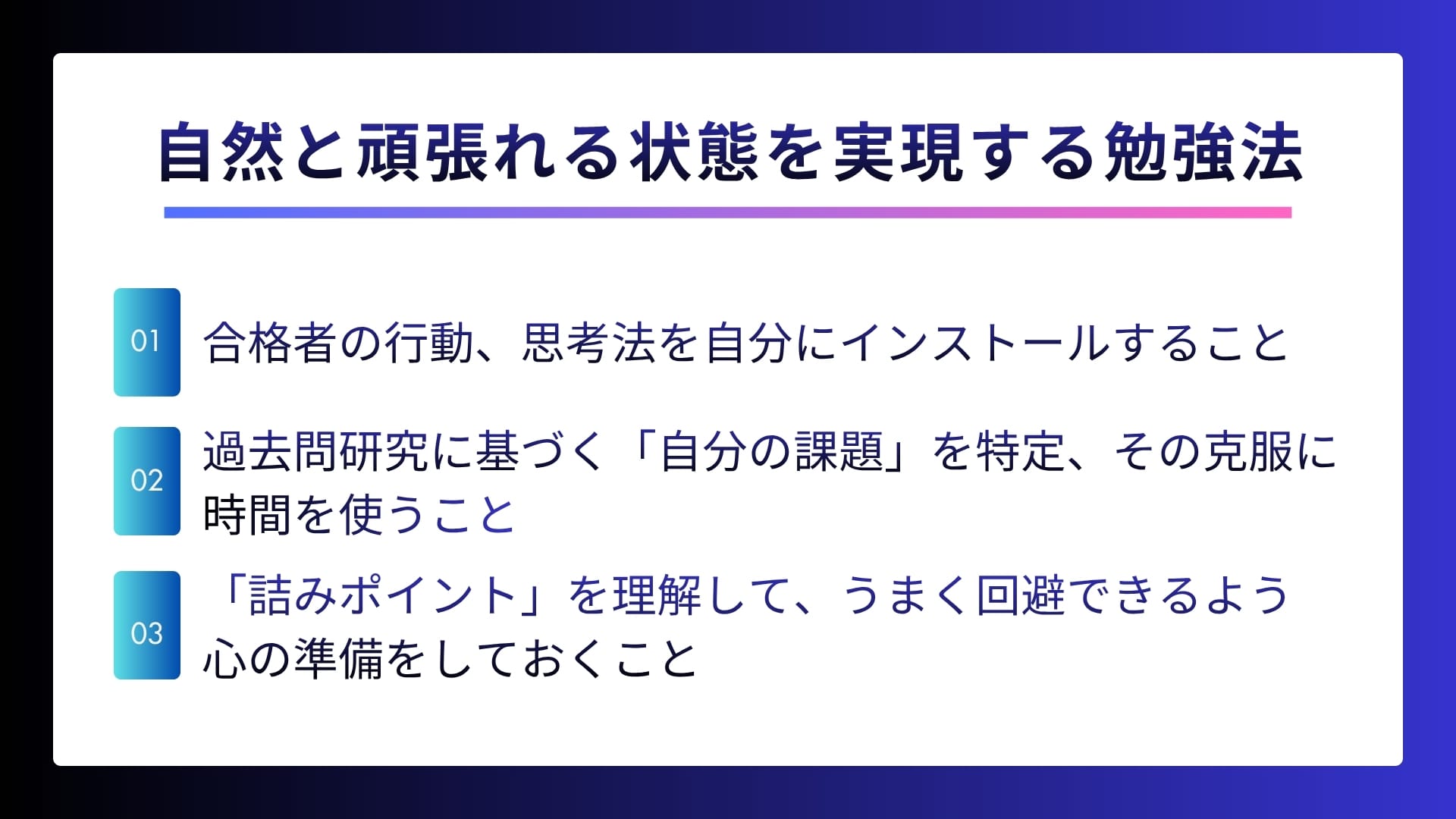 誤解を恐れずにいえば「合格すること」は目標というよりも、「自然に頑張れるようになった結果、得られるもの」くらいで考えています。